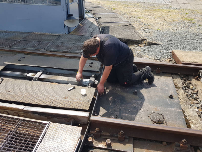 Auch die Drehscheibe bekam noch ein wenig Schmierstoff spendiert. Auf dem folgenden Bild wird gerade einer der Riegel geschmiert, der die Drehscheibe während des Auf- und Abfahrens von Fahrzeugen in Position hält.