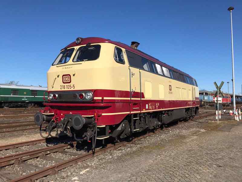 Außerdem hatten wir für einen Tag einen außergewöhnlichen Gast zu Besuch. Es handelt sich um eine Diesellok der Baureihe 218, die nun in Intercity-Farben der ehemaligen Deutschen Bundesbahn lackiert ist. Die Lok wurde 1971 bei der Firma Krupp gebaut und gehört heute der NeSA Eisenbahnbetriebsgesellschaft.