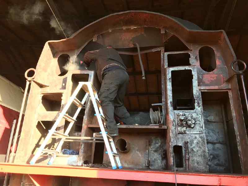 Weitere Fortschritte macht auch die Pflege der Dampflok 50 3570. Hier wurden die Klappen des sogenannten Aschkastens ausgebaut, gerichtet und mit neuen Blechen versehen. Der Aschkasten befindet sich unter dem Feuerrost der Lokomotive und nimmt Verbrennungsrückstände vom Feuer auf, das den Kessel beheizt.