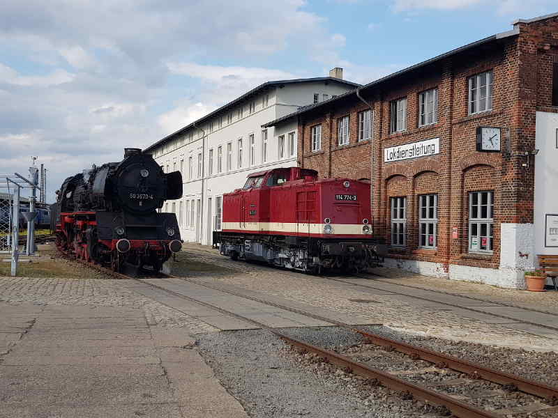 Außerdem steuerte die Eisenbahngesellschaft Potsdam noch einige Exponate für die Lokausstellung im Außengelände bei. Vielen Dank nochmal dafür! Im folgenden Bild erkennt man in dunkelroter Lackierung die Diesellok 221 145 der ehemaligen Deutschen Bundesbahn neben ihrer Schwester 118 692 der Deutschen Reichsbahn.