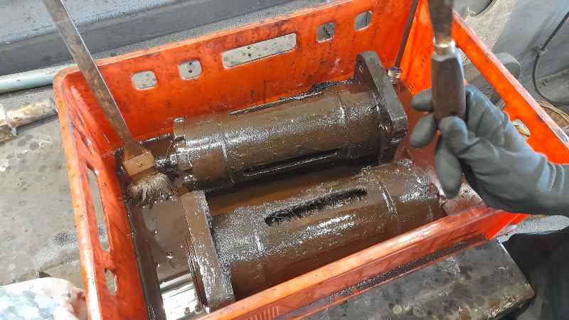 Auf dem folgenden Bild erkennt man die Kolbenstand und die obere Hälfte des Gehäuses, in dem sich die Dichtungen befinden. Die untere Hälfte des Gehäuses ist bereits abgenommen und man erkennt insgesamt fünf Dichtringe.