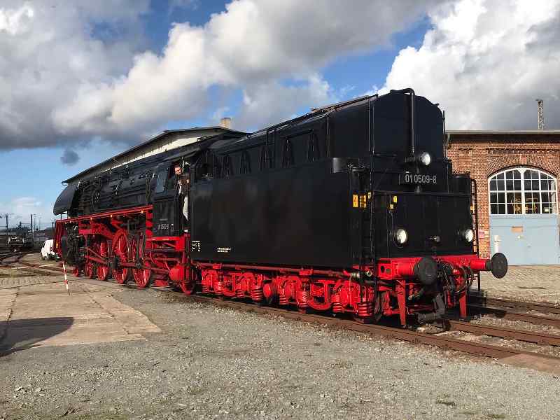 Wir freuen uns sehr, dass uns heute die Schnellzugdampflok 01 0509-8 erreicht hat. Die Schnellzugdampflok wurde 1935 bei der Firma Krupp gebaut und 1963 einer umfangreichen Rekonstruktion im Reichsbahnausbesserungswerk Meiningen unterzogen. Sie war bereits zwischen 1968 und 1976 in Wittenberge zuhause und gehörte damals mit ihren Schwesterlokomotiven zu den Stars des Bahnbetriebswerkes und der gesamten Deutschen Reichsbahn. Die Lokomotive gehörte zu den leistungsfähigsten Dampfloks, die je über deutsche Schienen gefahren sind und sie beförderte unter anderem die Interzonenzüge zwischen Hamburg und Berlin und war damit im sehr hochwertigen Reisezugdienst eingesetzt. Sie gehört heute der Firma Pressnitztalbahn, die sie regelmäßig vor Sonderzügen im gesamten Bundesgebiet einsetzt.