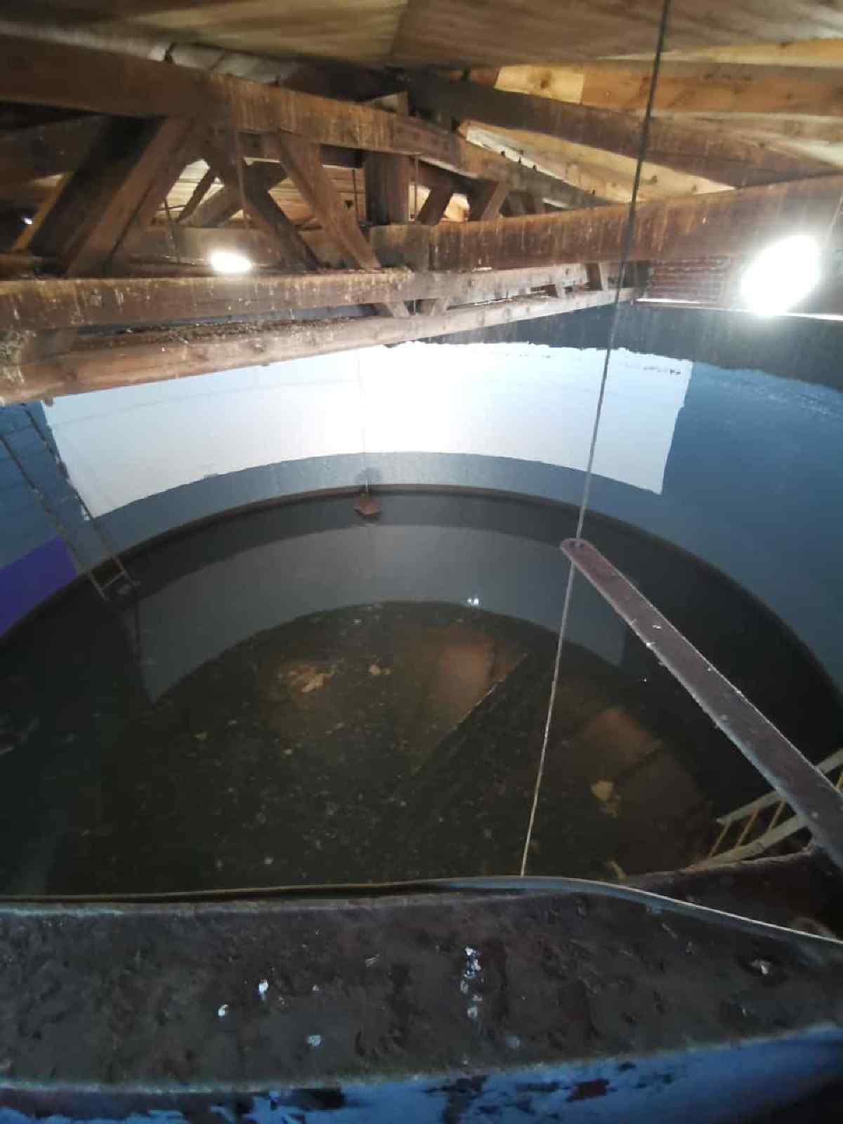 Oberhalb der Zwischendecke erreicht man den Vorratsbehälter. Eine weitere Treppe führt nach oben zum oberen Rand des Behälters