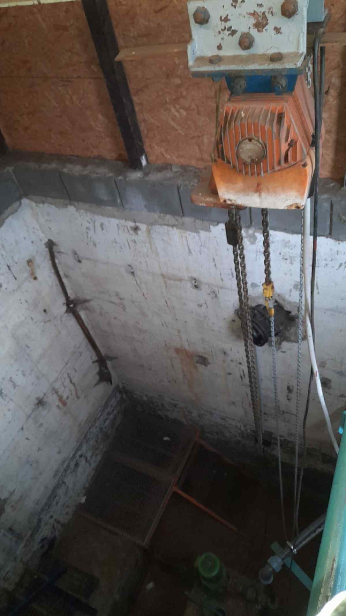 Außerdem haben wir einen elektrischen Kettenzug eingebaut, der uns das Wechseln der Pumpe deutlich erleichtert.