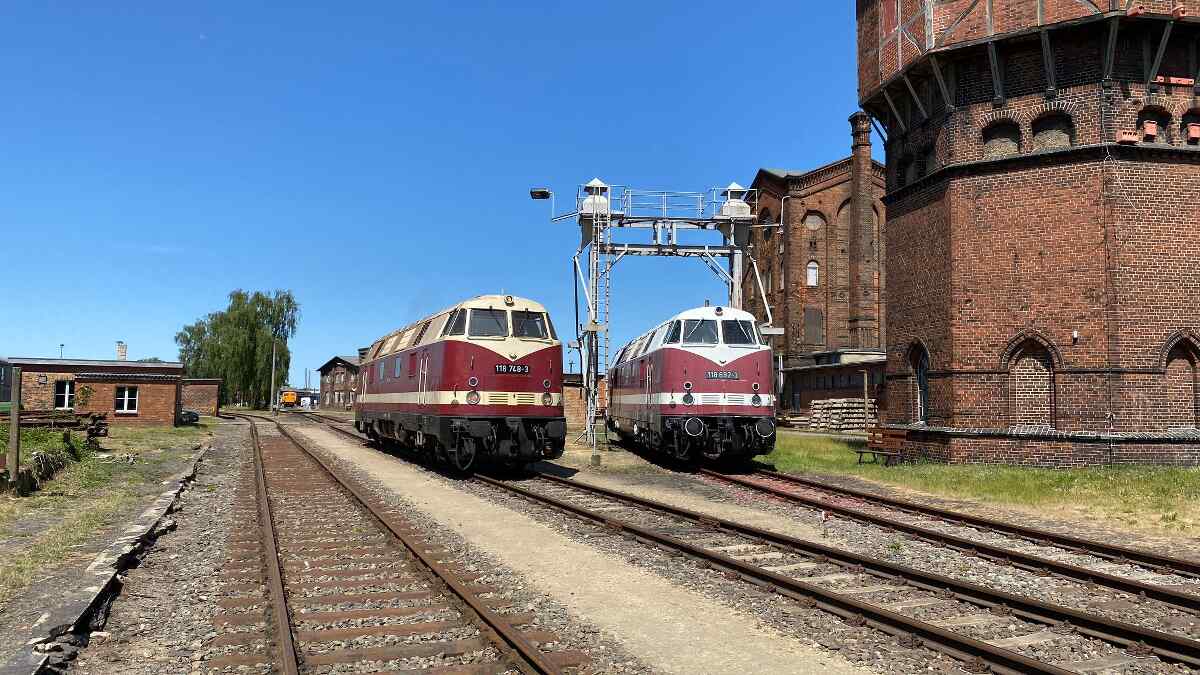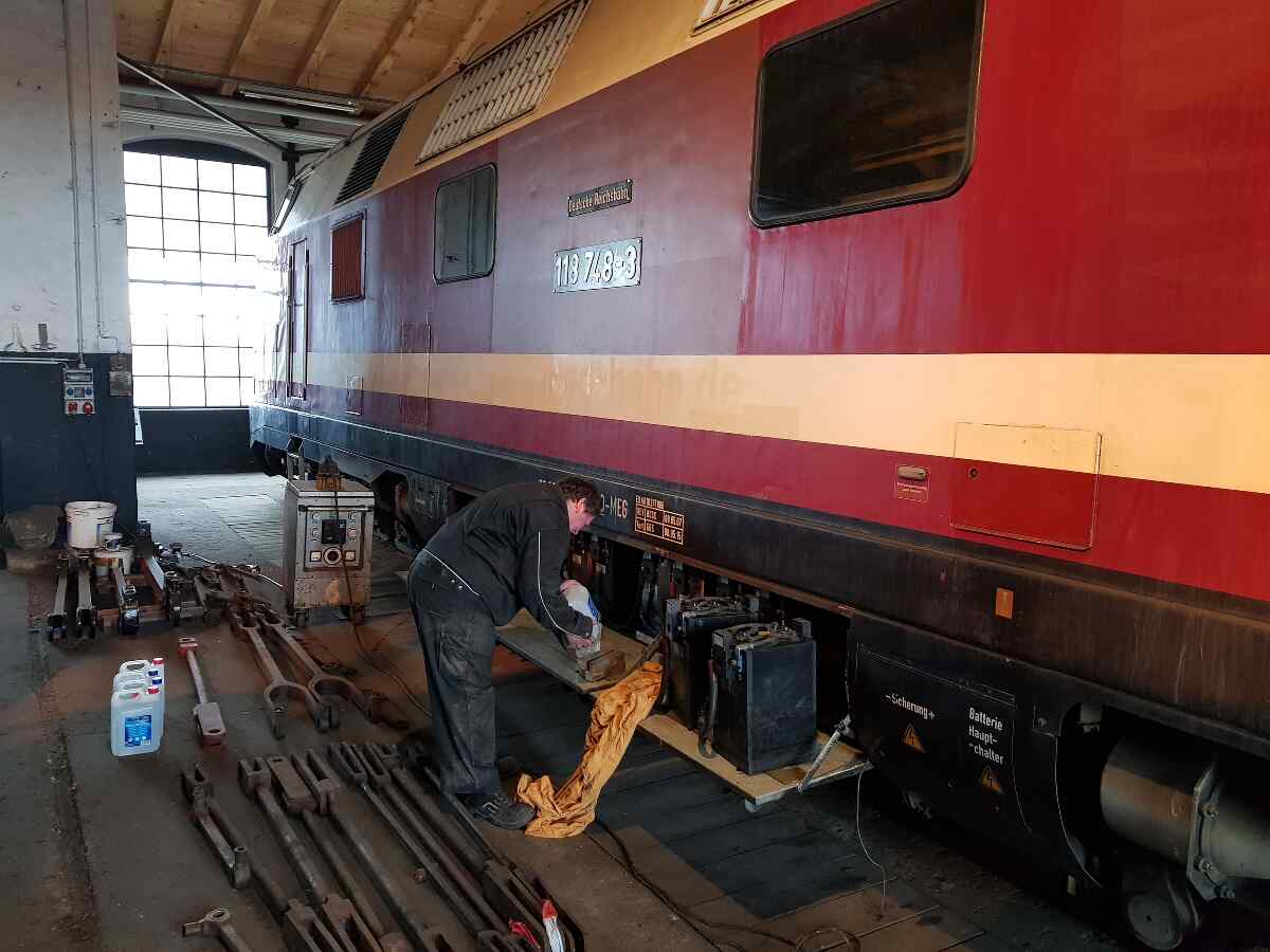 Der 3. Juni 2023 war für uns ein großartiger Tag, denn es lagen seit langem nicht mehr gehörte Geräusche in der Luft. Das hatte folgende Hintergründe: Die Aufarbeitung weiterer Diesellokomotiven wurde begonnen. Dazu zählt zunächst unsere Diesellok 118 748. Diese Maschine wurde 1968 beim Lokomotivbau Karl Marx in Babelsberg gebaut und war bis Mai 2015 im Einsatz, zuletzt vor Güterzügen. Sie verfügt über zwei Motoren mit je 1.000 PS und kann bis zu 120 km/h schnell fahren.