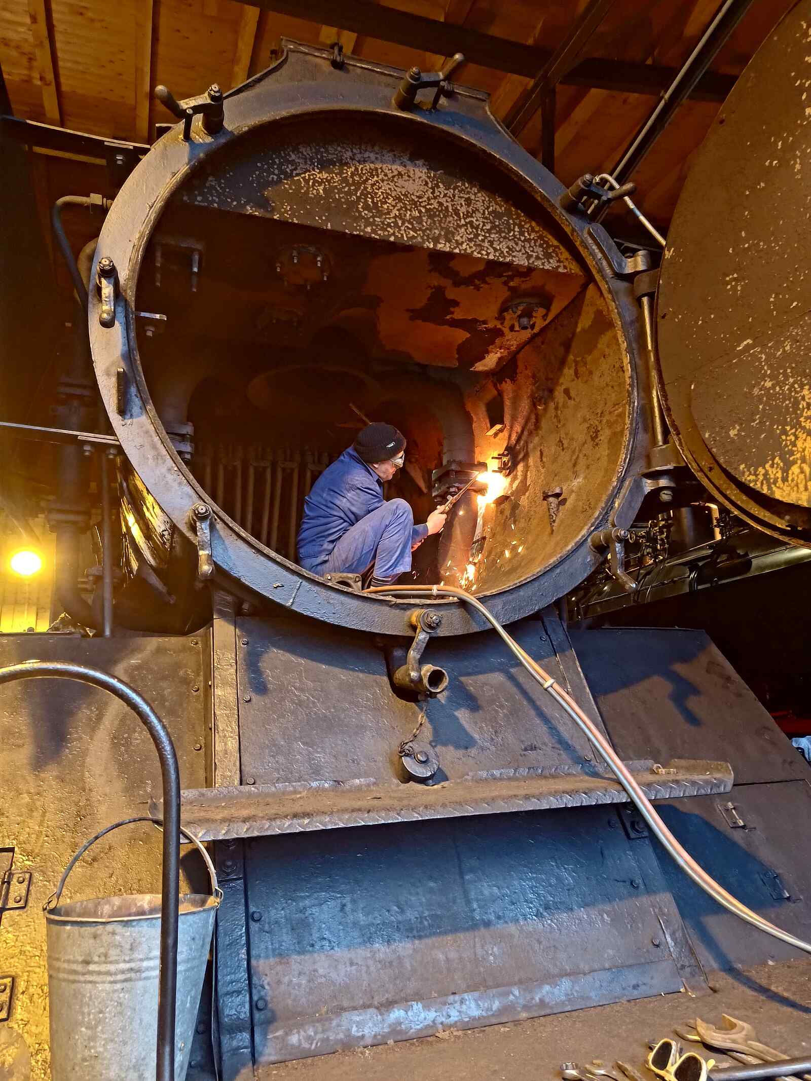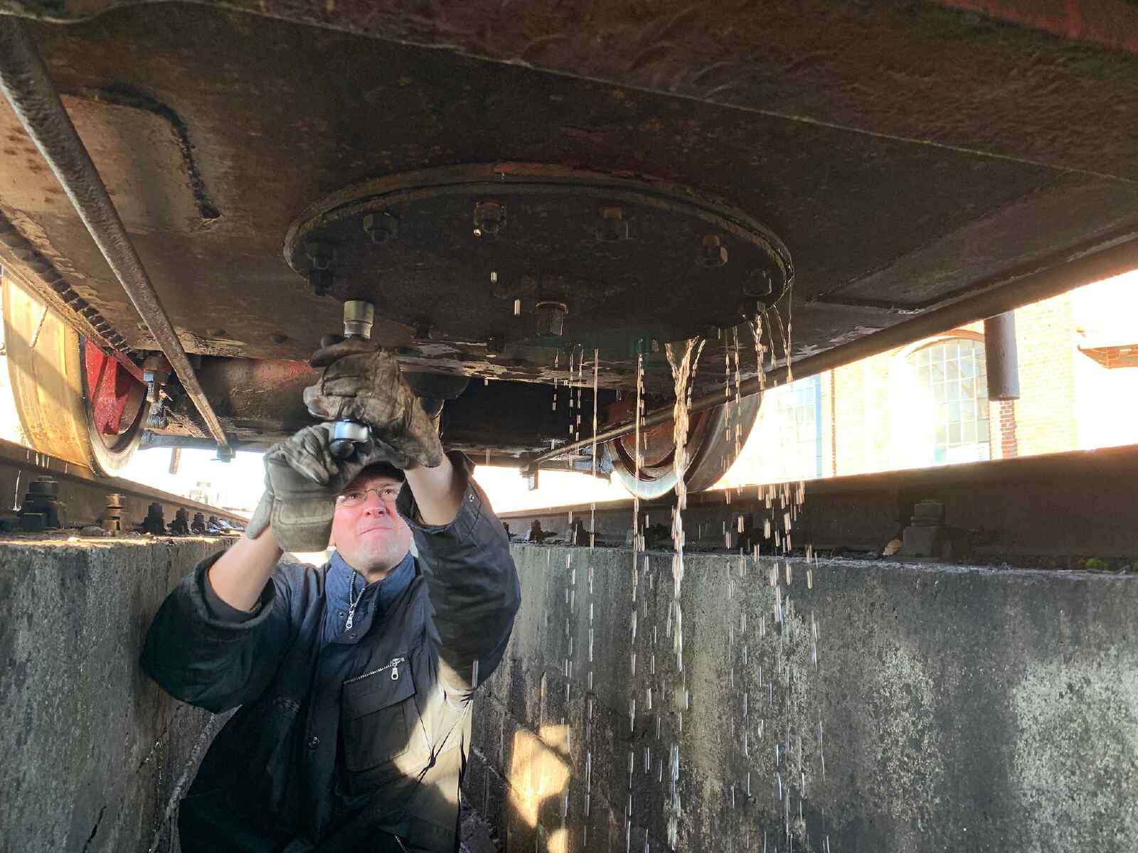 Wir haben uns auch weiter um unsere kleine Dampflok Emma gekümmert. Hier mussten die Wassertanks im Rahmen der Lokomotive gereinigt werden, damit Kalk und Schmutz nicht irgendwann von den Speisepumpen der Lok angesaugt werden und diese verstopfen. Das ist eine ziemlich anstrengende und schmutzige Angelegenheit, weil man die entsprechenden Luken unter der Lok öffnen und dann den Schmutz aus den Tanks herauskratzen muss.
