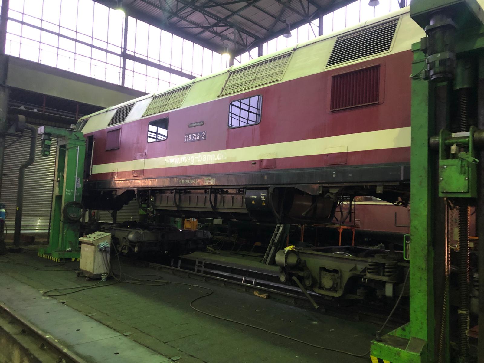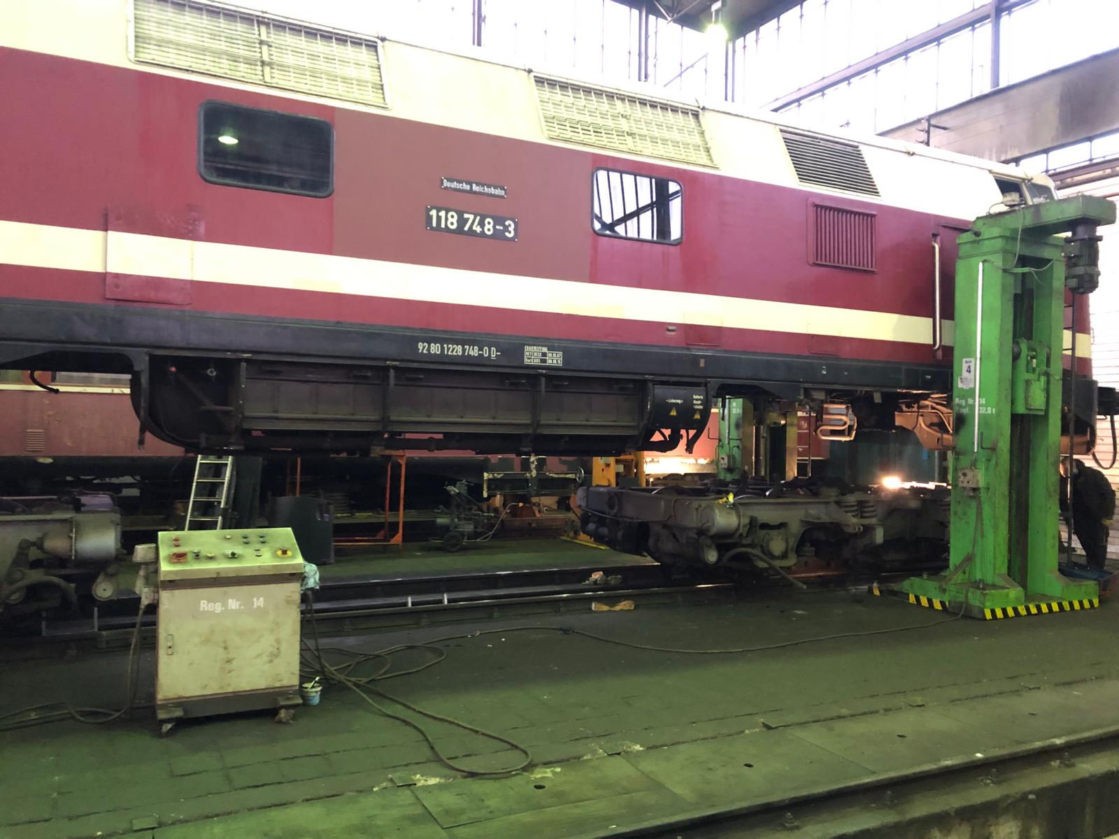 Das größte Weihnachtsgeschenk für uns ist die betriebsfähige Aufarbeitung der Diesellok 118 748-3, die - wie schon berichtet - zur Hauptuntersuchung in eine Fachwerkstatt in Klostermannsfeld gebracht wurde. Hier gehen die Arbeiten mit großen Schritten voran. Vor einiger Zeit wurde die Lok in die Werkhalle rangiert, um den Lokkasten von den Drehgestellen abzuheben. Zunächst werden die Drehgestelle inklusive der darin verbauten Achsen und Bremsteile einer genauen Kontrolle und Aufarbeitung unterzogen, damit sie in den kommenden Jahren störungsfrei laufen können. Freuen Sie sich jetzt schon mit uns auf den Augenblick, wenn die Lok wieder aus eigener Kraft fährt und auf dem deutschen Eisenbahnnetz eingesetzt werden kann!