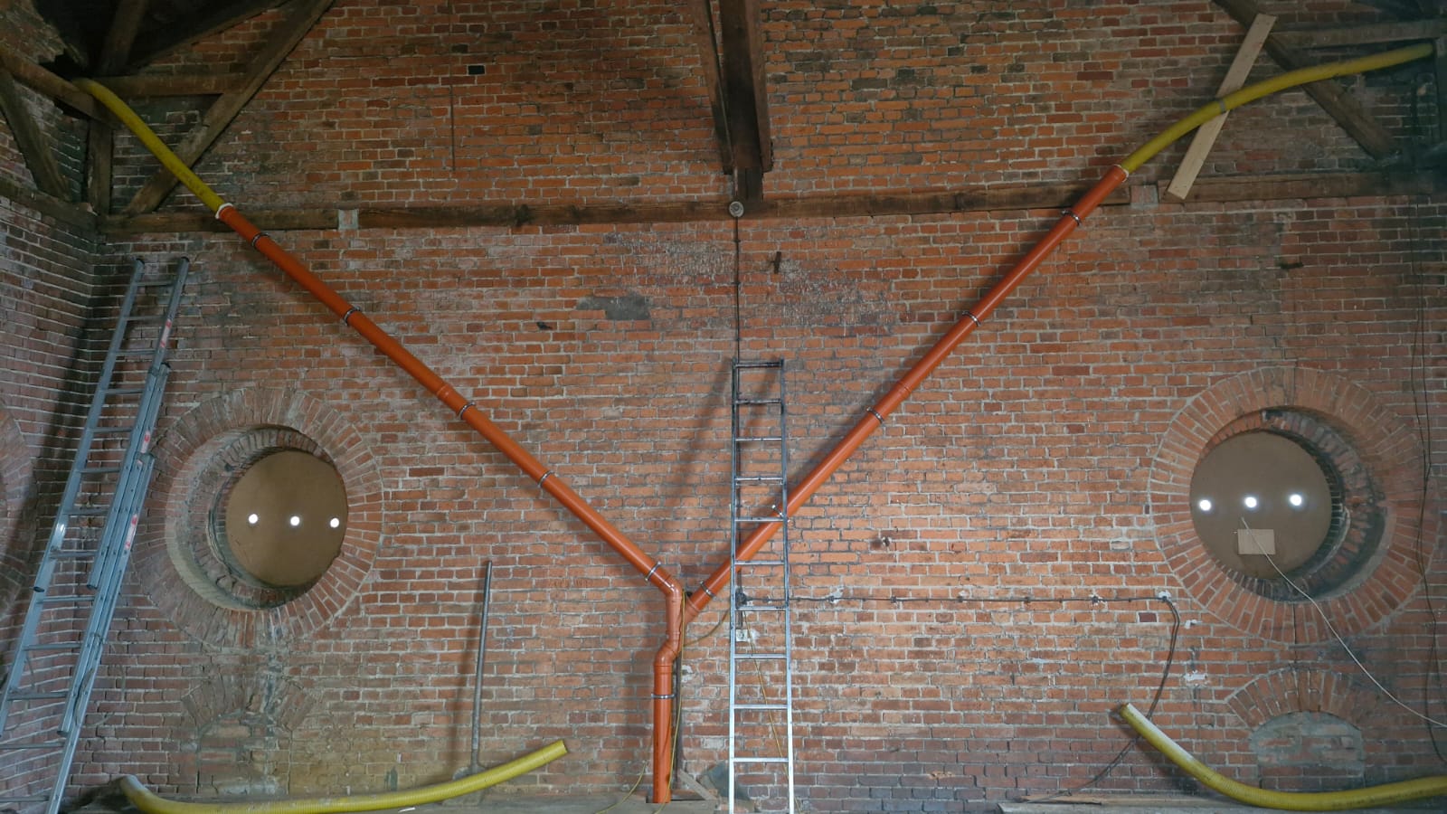 Von der Öffentlichkeit ungesehen, aber dennoch wichtig für den Erhalt der Bausubstanz haben wir uns dazu entschieden, etwas zum Erhalt des großen Wasserturms auf dem Museumsgelände beizutragen. Dieser ist zwar derzeit nicht direkt Bestandteil unseres Museums. Dennoch halten wir es für sinnvoll, seine Bausubstanz zu erhalten, um ihn perspektivisch nutzen zu können. Hierzu haben wir neue Abflussrohre für die Regenrinnen angebracht. Dadurch wird nun sichergestellt, dass das Regenwasser kontrolliert abfließt und nicht mehr großflächig über die Außenmauern strömt und die Ziegel und Fugen auswäscht.