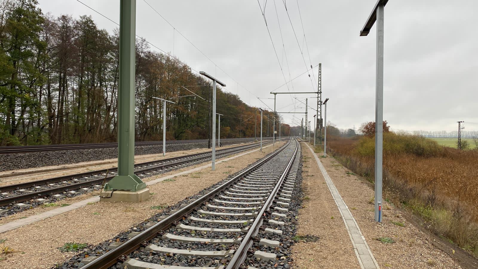 Zuletzt werfen wir noch einen Blick auf die neue östliche Einbindung der Industrie- und Hafenbahn Wittenberge. Hier wurde ein weiteres Gütergleis und eine Weichenverbindung in die Streckengleise aus und in Richtung Berlin geschaffen. Das schafft unter anderem eine deutliche Vereinfachung der Abfertigung der im Wittenberger Hafen gebildeten Containerzüge. Auch hier wird noch an den elektrischen Anschlüssen der Weichen und Signale sowie der Installation der Oberleitung gearbeitet.